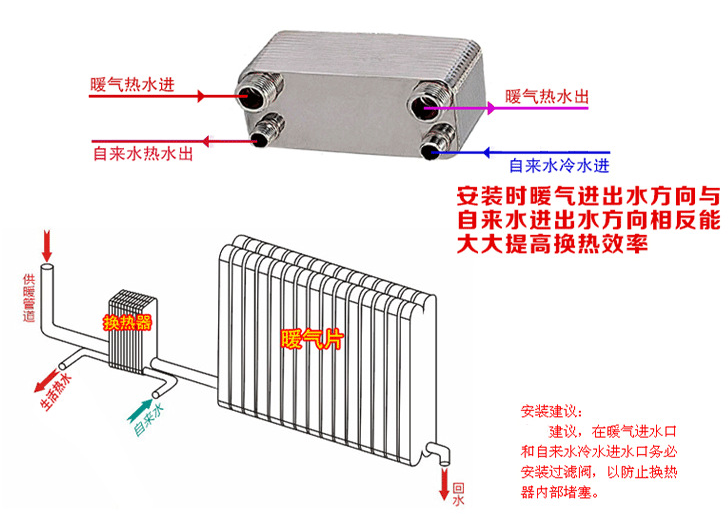 板式换热器具有传热效率高、占地面积小、热损失小、结构简单、易于搬运安装、易拆装、用热量调整灵活、可定期清洗或更换板片、可随用热量增加而增多板片而不需更换任何设备(如容积式换热器当满足不了需求而增容时,必须更换或增加设备)等优点。